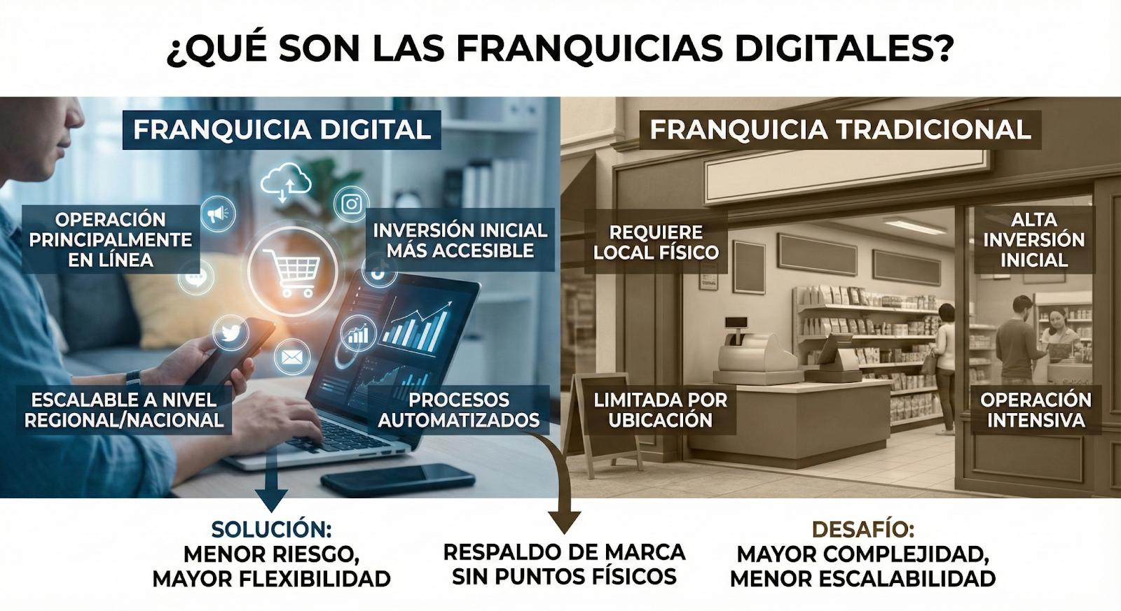 Las franquicias digitales surgen como respuesta a una necesidad clara del mercado: invertir en un negocio con menor complejidad operativa, mayor flexibilidad y respaldo de marca, sin empezar desde cero. Para perfiles que buscan diversificar ingresos o entrar al mundo digital con menor riesgo, este modelo ofrece una alternativa más estructurada que emprender de forma independiente.